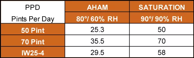Most small portable dehumidifiers advertise their moisture removal capacity at extreme saturation conditions 90% Relative Humidity (RH) and 90°F, which is highly unlikely for a typical home. The standard for testing the effectiveness of a dehumidifier is at average conditions, 60% RH and 80°F, the standard by the Association of Home Appliance Manufacturers (AHAM)4. This means portable dehumidifiers offer much less moisture removal than stated in typical conditions. “As a rule of thumb, a dehumidifier can extract about half as much moisture a day in AHAM conditions as it can in saturation conditions”. 4